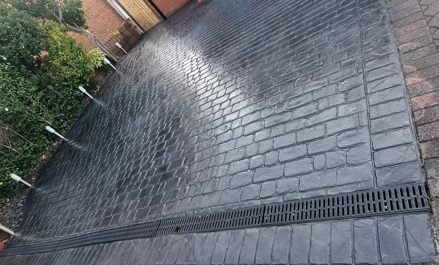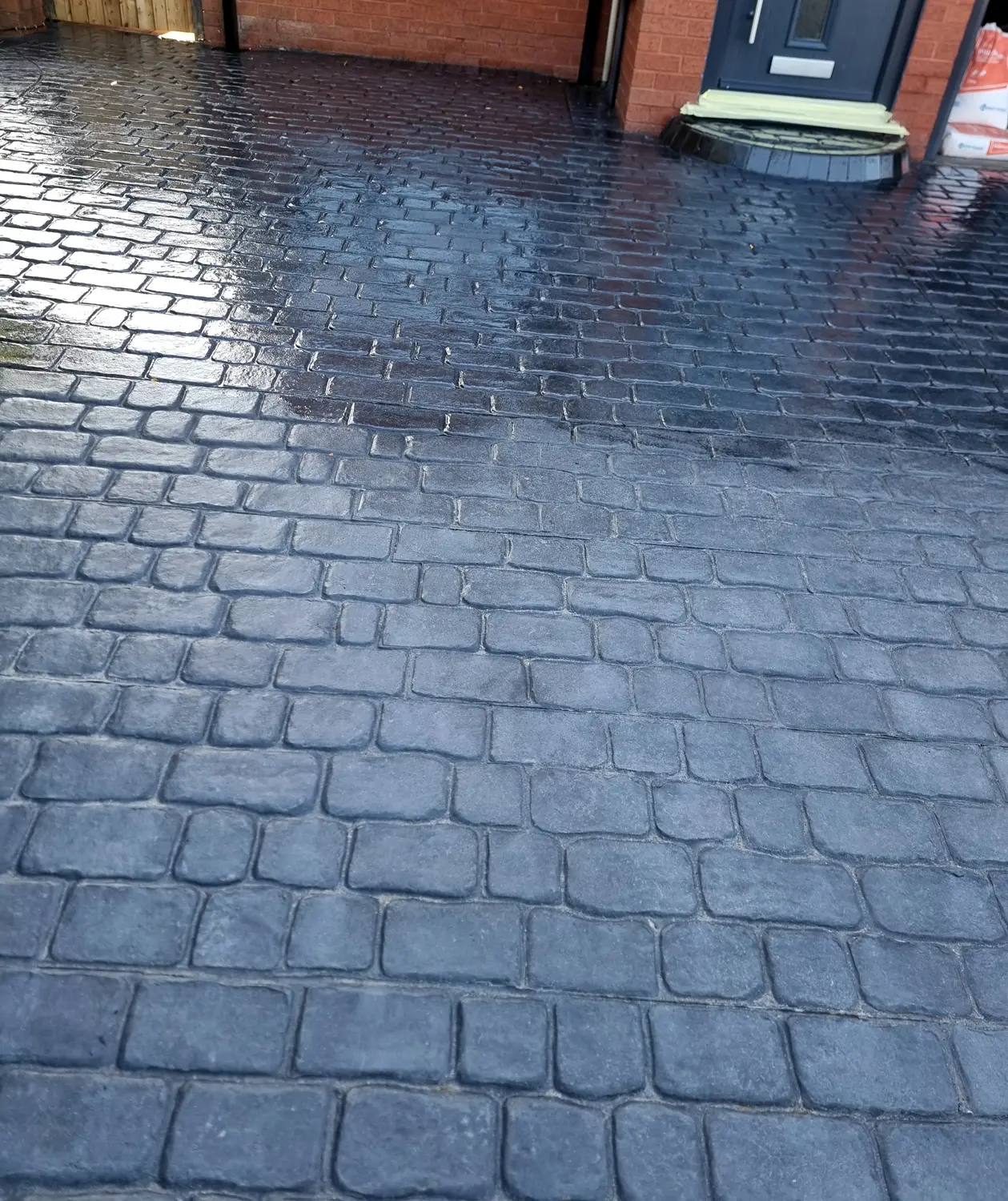 DH Driveways have just freshly resealed a Pattern Imprinted Concrete driveway in Ashton-In-Makerfield, Lancashire. Cleaning off and removing any build ups from the original 5 years old Country Cobble style in Classic Grey concrete and leaving it looking like it was installed yesterday.